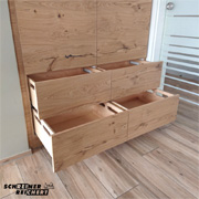 Schubkästen in Eiche mit farblich abgesetzten Fronten.