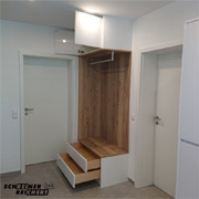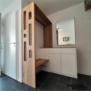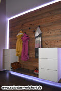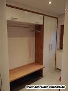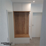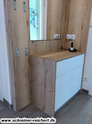 Garderobe in weiss und Multiplex, belegt mit markantem Eiche Dekor.