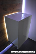 Korpen aus Mineralwerkstoff mit eingefräster Ablagemulde und durchleuchtender Hinterkante.