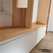 Stollen und Sitzbank in Eiche astig furniert, Oberfläche mit Klarlack versiegelt.