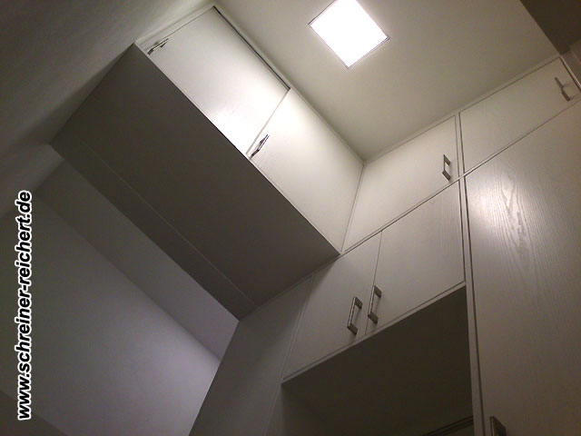 Garderobe in Esche Weisslack, raumhoch in Dachschräge eingepasst.