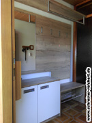Eiche astig Dekor auf Multiplexträger mit weissen Fronten. Kleiderstange und Klapphaken aus Edelstahl.