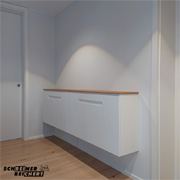 Wandhängendes Flurmöbel in Weisslack und geölter Kernesche.