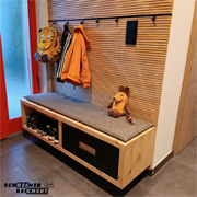 Frei hängende Sitzbank mit Schuhablage und Hakenleiste.