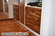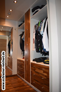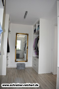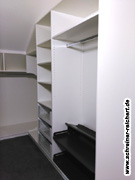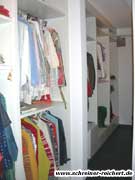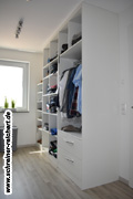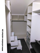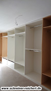 Ankleide komplett in weiss mit diversen Fächern, Kleiderstangen und großen Schubkästen mit Edelstahlbügelgriffen.
