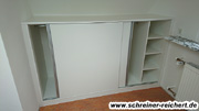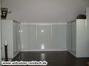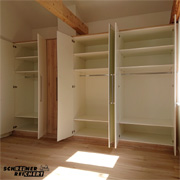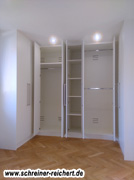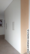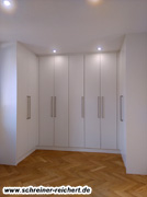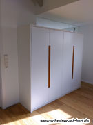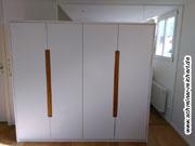 Kleiderschrank in U-Form mit Drehtüren. Oberfläche in KBS weiss mit Edelstahlbügelgriffen. Hinterlüftung mittels Ausfräsungen in Rückwand.