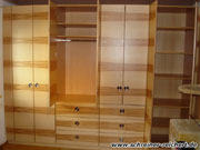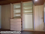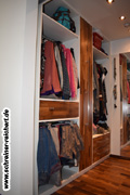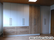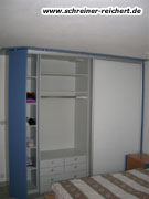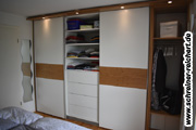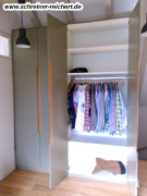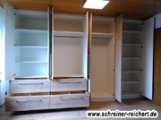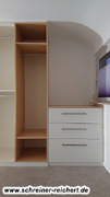 Kleiderschränke mit Schiebe-, und Drehtüren, sowie offenem Regal mit Schubkästen.