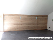 Vorsatzfronten mit Schiebetüren in lebhaftem Eiche Dekor.