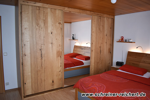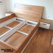 Doppelbett in Eiche massiv mit schwebenden Nachttischen und ausreichenden Be- und Entlüftungsöffnungen