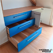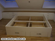 Bettkasten mit Klappen und Schubkästen ausgestattet.