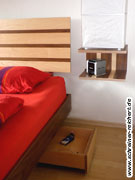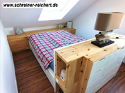 Bettkasten und schwenkbare Nachtkästchen aus Zirbenholz.