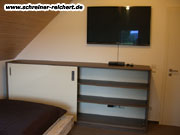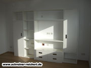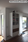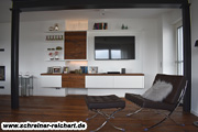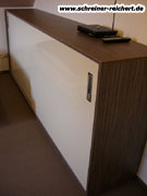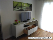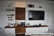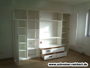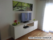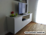 Offenes TV-Regal mit geschlossenene Elementen. Oberfläche in weiss Lack.