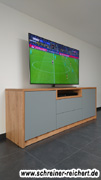 TV-Möbel in gekalkter Eiche mit großen, grifflosen Auszügen und integriertem Lautsprecher.