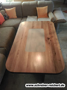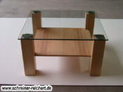 Kernbuche mit Massiven Tischbeinen und Glasplatte auf Edelstahlscheiben.